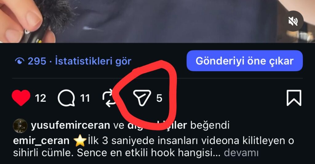 Reels videosu hikayede paylaşmak isteyen kullanıcılar, ilk olarak paylaşmak istediği gönderiyi ekranlarına açmalıdır. Bu seçilen içerik sizin içerisiniz olmasa bile sizde kendi hikayenizde paylaşabilirsiniz. İnstagram bu seçeneği de kullanıcılarına sunuyor. Daha sonrasında aşağıdaki görselde belirtilmekte olan paylaşma butonuna basmamız gerekmektedir. Bu buton uygulama içerisinde kağıttan bir uçak simgesinde bizlere sunuluyor. İlk olarak bu butona tıklamamız gerekiyor.
